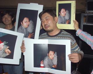 今月も大盛況でした。この日、大佐のアルバムの中でも名盤と呼ばれる“この夜に・・・”の再販があり、このアルバムの曲を中心にライブは盛り上っていきました。恒例の?星☆チューバさんのお笑いもあり、ここで大佐のお酒にまつわるエピソードなども聞けて、違った意味での盛り上がりもありました。 そしてロックンロール大王の登場です。誰かって?ロックンロール大王はロックンロール大王です。大佐もそのように、言っておられました。“借金大王”を熱唱して大いに盛り上り、アンコールが沸きました。“ツッパリハイスクールロックンロール”を披露してくれて、何で大佐のライブでこれが聞けるのか?と思いましたが、大変盛り上りました、大王様ありがとう!! ライブ終了後は恒例のまっかちんリスナーとの歓談です。今月は緑区の新人エルさん、久紗美小町さんとお会いすることが出来ました。そして先月に続きえみとんさんともお会いできました。御主人も一緒です。えみとんさん御夫妻は、ラジオ日本の難聴地域に住んでいて(私もそうだが)どうやって聞いているか、という話で盛り上りました。やっぱり窓際にラジオを置くのが一番無難なようです。でもエアコン入れたり電子レンジ使ったりしちゃ駄目みたい。(@_@;) それから表紙に写真アップしましたけど、ダン吉さんの雄姿?を大佐が持ってきてくれました。この大佐が持ってきてくれた写真とのショットです。大佐のファンクラブの二次会で寝てしまい、悪戯書きをされたらしいのですが、全く起きなかったそうです。おまけにこの姿のまま始発に乗って帰ったそうです。ダン吉さん!!遠慮なく使わせていただきます。 そんな模様をちょっと画像アップしたのでみて下さい。 |