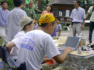 第一ステージ終了。提出物の松ぼっくりと30グラムのものをだし、けん玉に挑戦。玉をのせる皿の大きさによりもらえるポイントが決まる!!